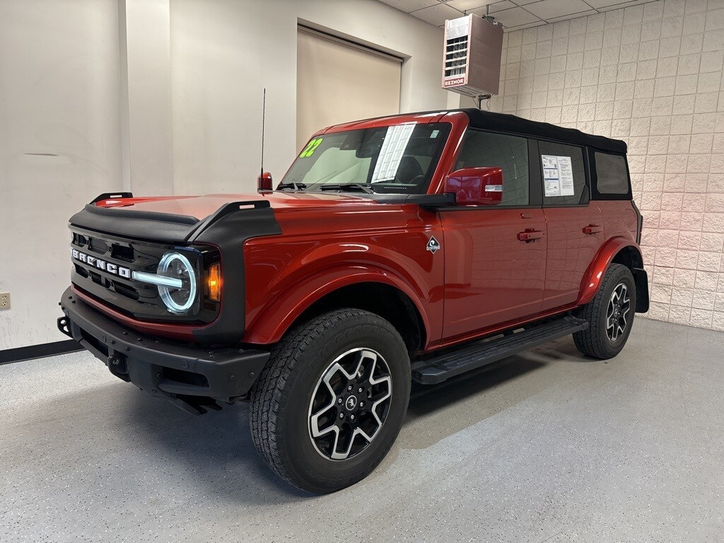 Certified. Chili Pepper Red 2022 Ford Bronco Outer Banks 2.7 Liter EcoBoost V6 Automatic 4WD 4WD 10-Speed Automatic 2.7L EcoBoost V6 Adaptive Cruise Control, Evasive Steering Assist, Exterior Parking Camera Rear, Front dual zone A/C, Front Parking Sensors, Heated Cloth Bucket Seats, Heated Steering Wheel, Radio: B&O Sound System by Bang & Olufsen, Wireless Charging Pad.